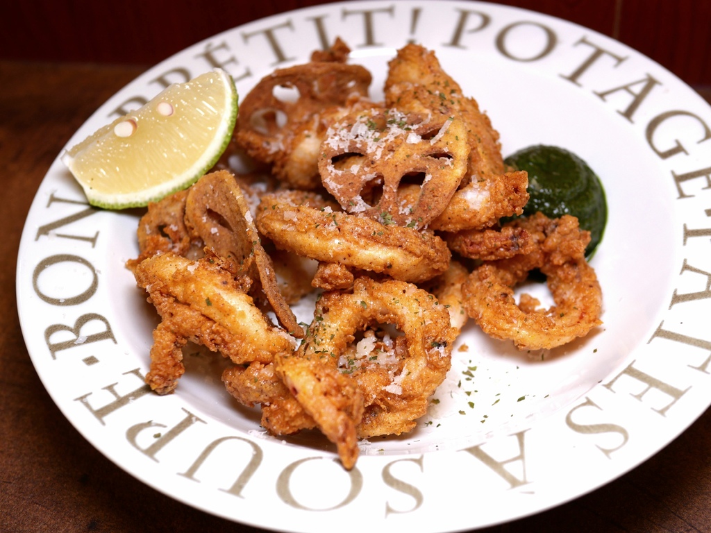中卷炸得不錯,更喜歡蓮藕脆片,義大利麵分成雞或海鮮高湯兩種底,