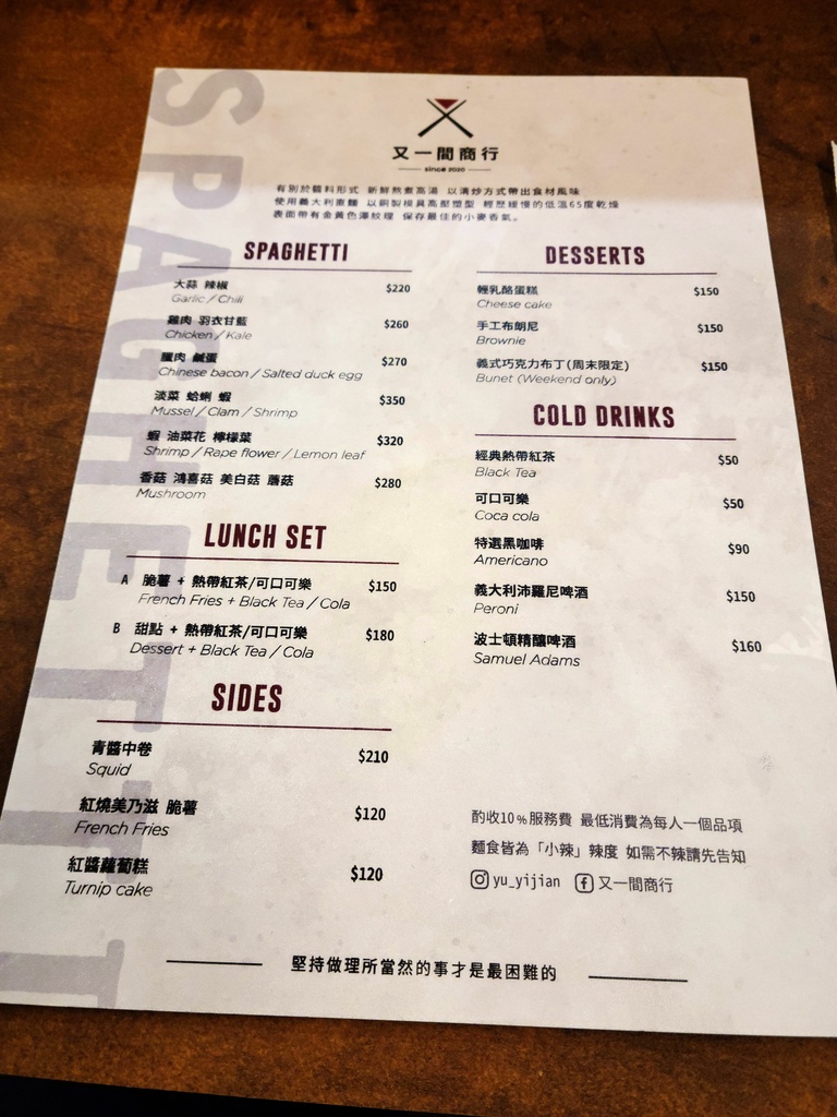 照片記錄:青醬中卷210、大蒜辣椒義大利麵220、紅茶50。