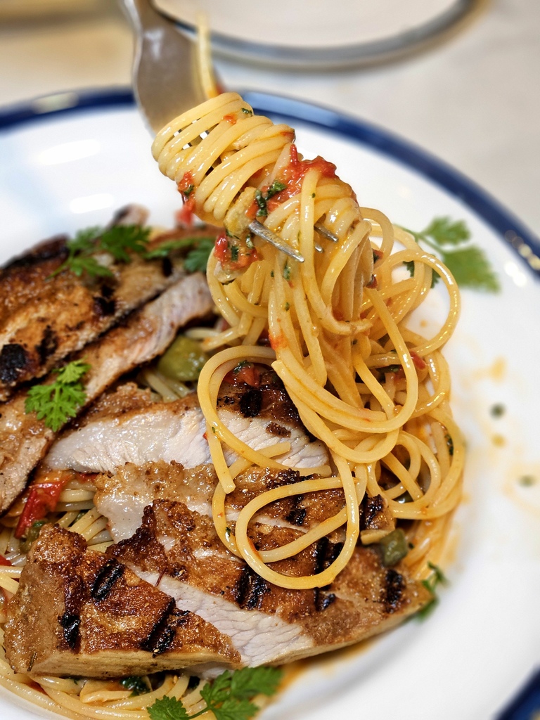 (煙花女麵,要求麵硬,收汁、調味皆可~我酸豆還可再多一點,豬頰肉份量多而且炭烤的熟度剛好)