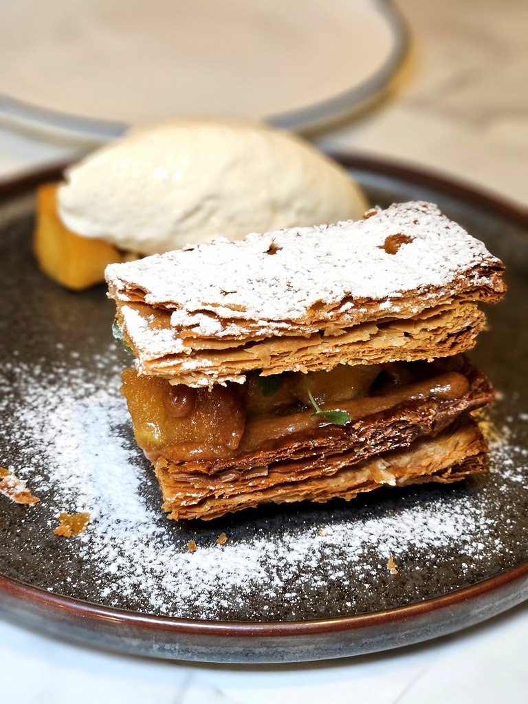(法式千層酥,自製酥餅做得意外不錯,脆度夠、沒有很重的油味)