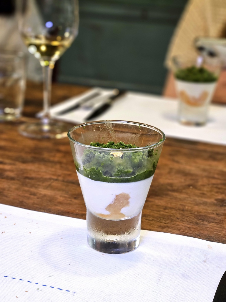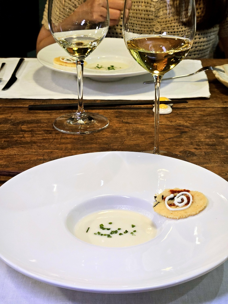 畢竟我人少之前都坐窗邊,終於感受到不一樣的用餐氛圍,開胃小點第一道玉米冷湯又甜又涼,