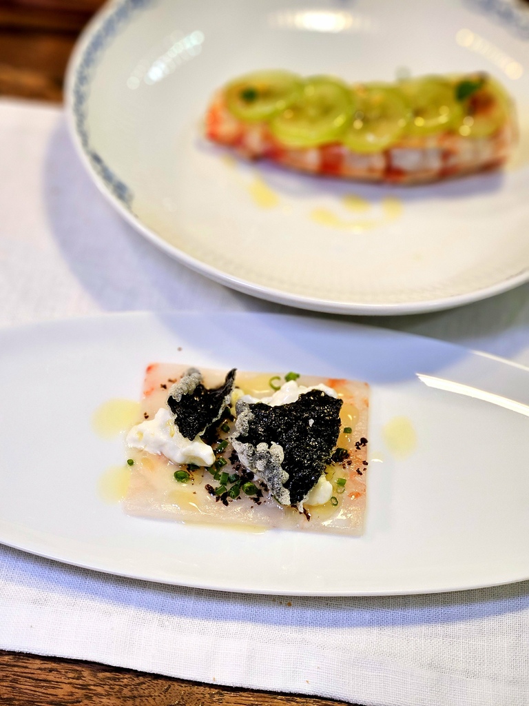 前菜第一道是雙拼蝦,葡萄蝦拍成薄片,甜甜糯糯放上香脆的海苔米餅、絲綢乳酪,