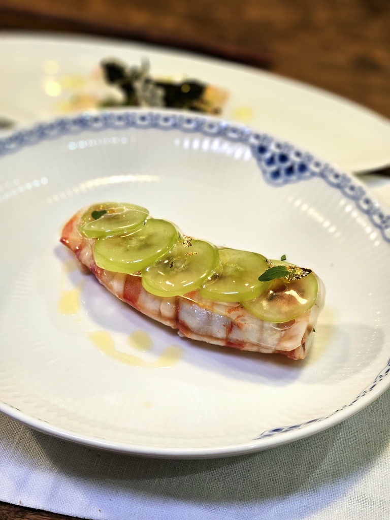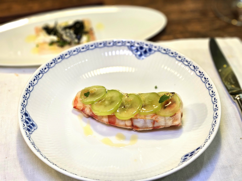 (海蝦薄片/塩昆布與絲綢乳酪/海苔米餅與山葵油 & 油封明蝦/紫蘇梅醬/麝香葡萄甜酒凍)