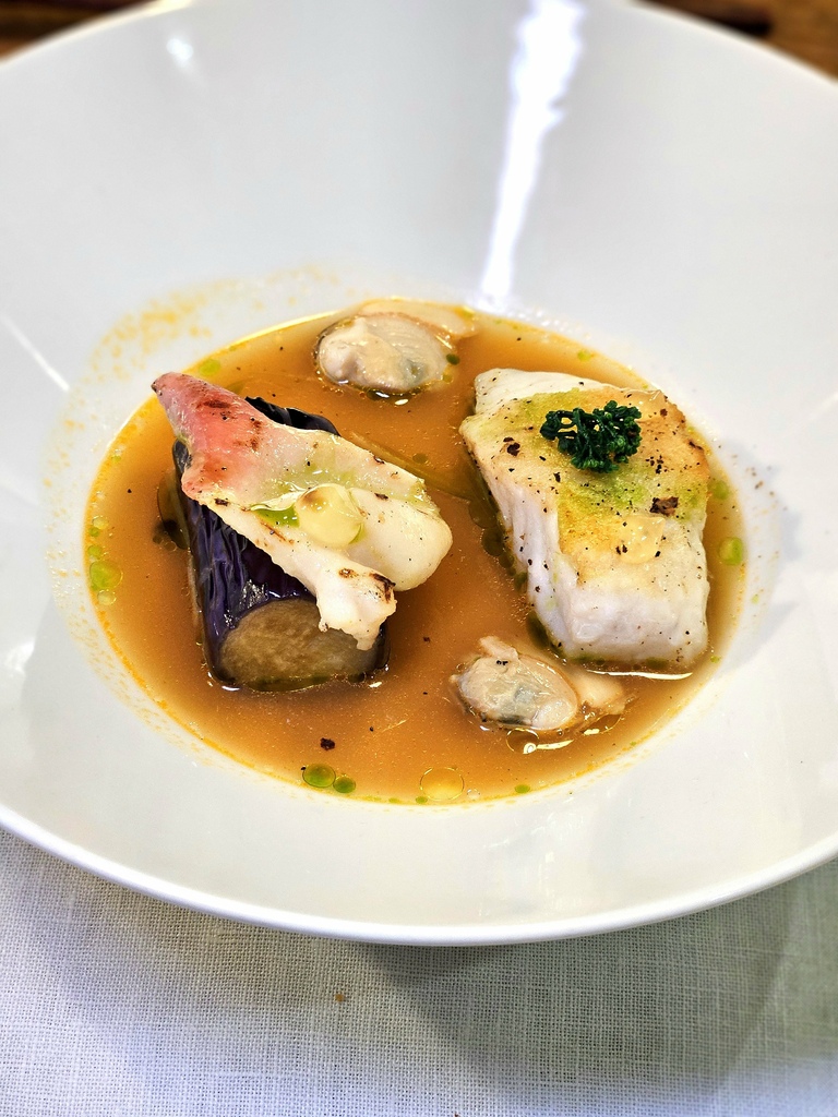 (柴魚昆布蕃茄海鮮湯/海魚與烤北寄貝/漬茄子/花山椒與茗荷/柑橘油)