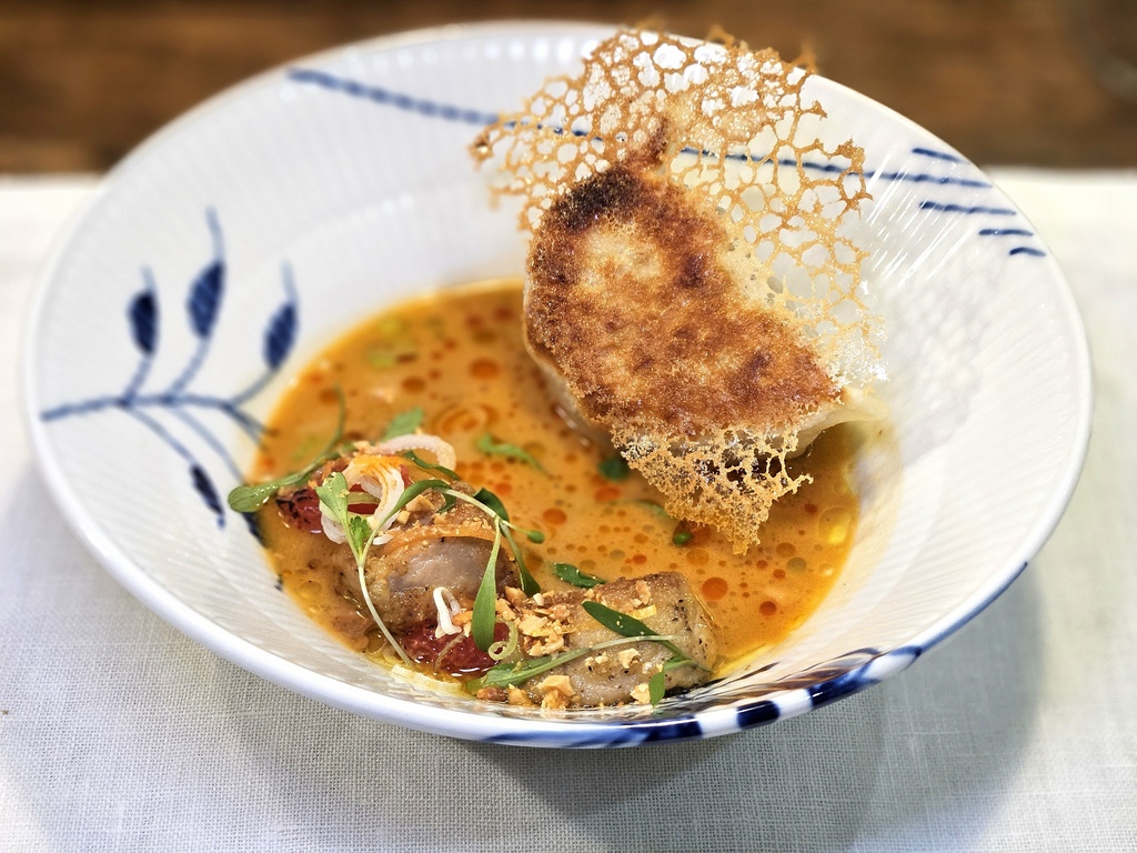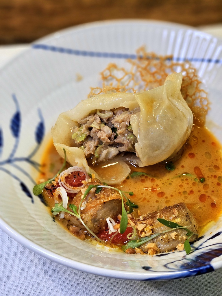 (冰花煎餃與鴨肝/葡萄柚/花生辣油雞湯醋)