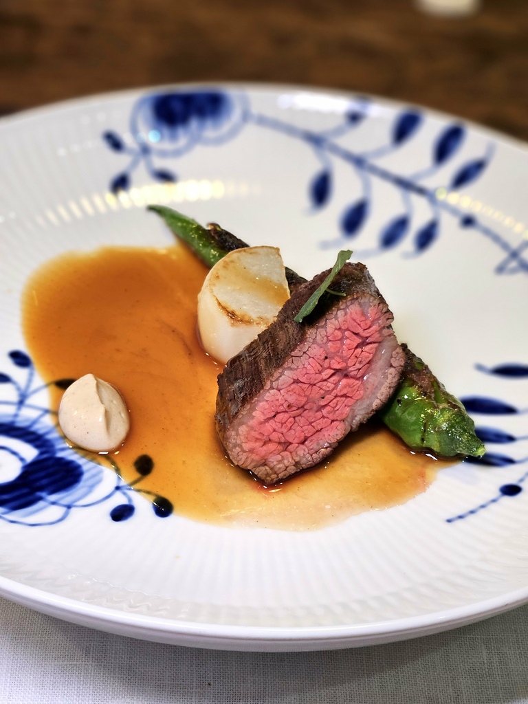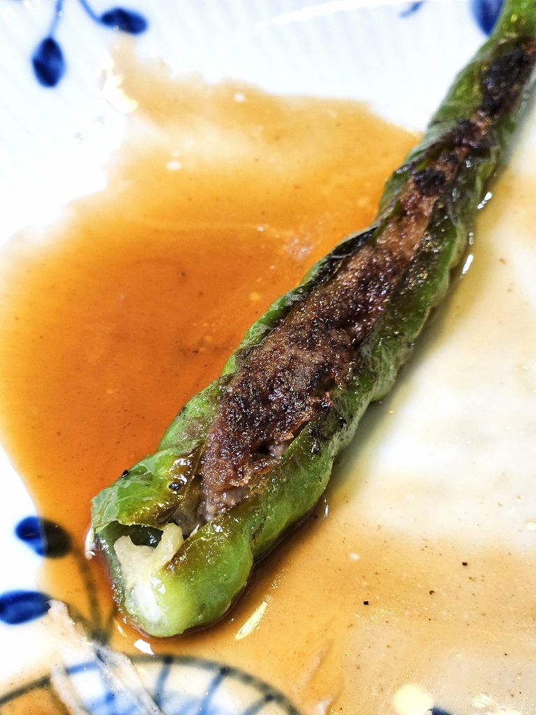 (煙燻牛小排/酥炸糯米椒填焦糖洋蔥肉餡/胡麻豆漿泥/薑味柚子胡椒汁)