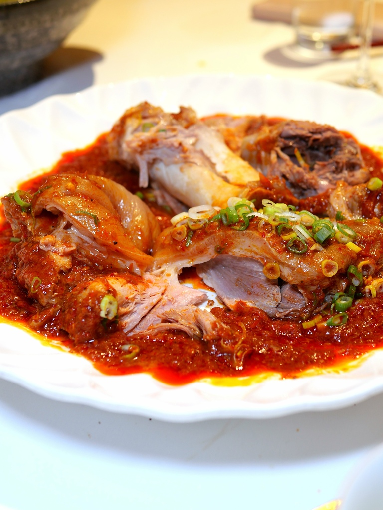 東坡肘子每次吃都覺得佐酒或者搭麵條都好,醬汁酸多而微辣、整體肉質柔嫩而不柴,