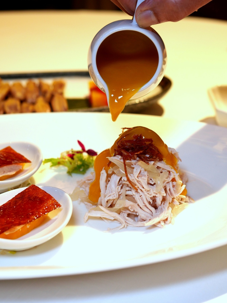 前菜兩道都不錯,香芒雞件佐沙律分兩側,這是土雞燙熟再經慢烤,