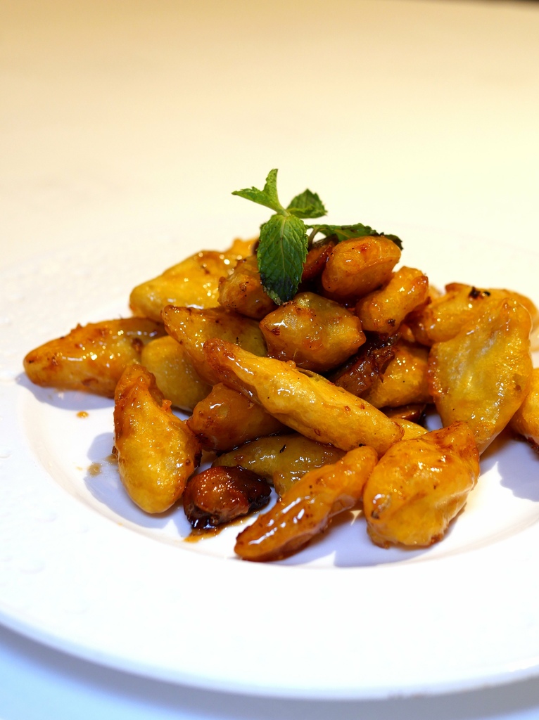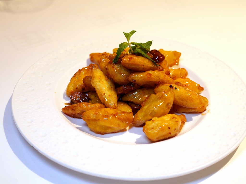 山楂脆脆茄這道~得說外觀相當不起眼,但是處理非常好,炸粉輕薄膨脆、撇油乾淨,