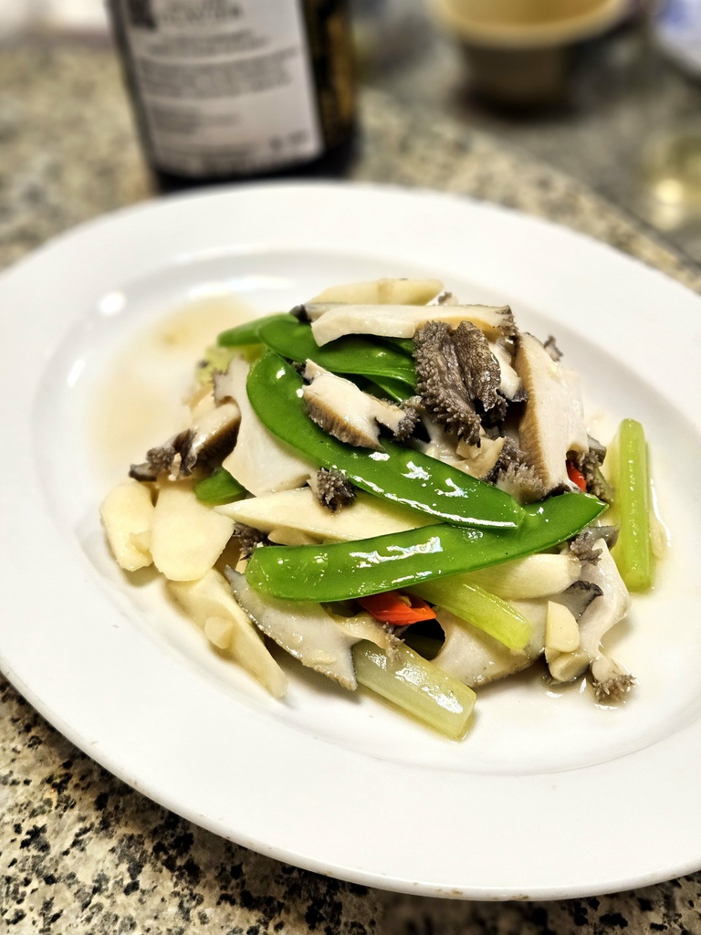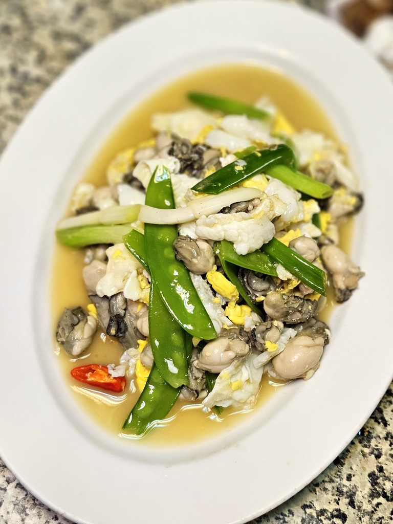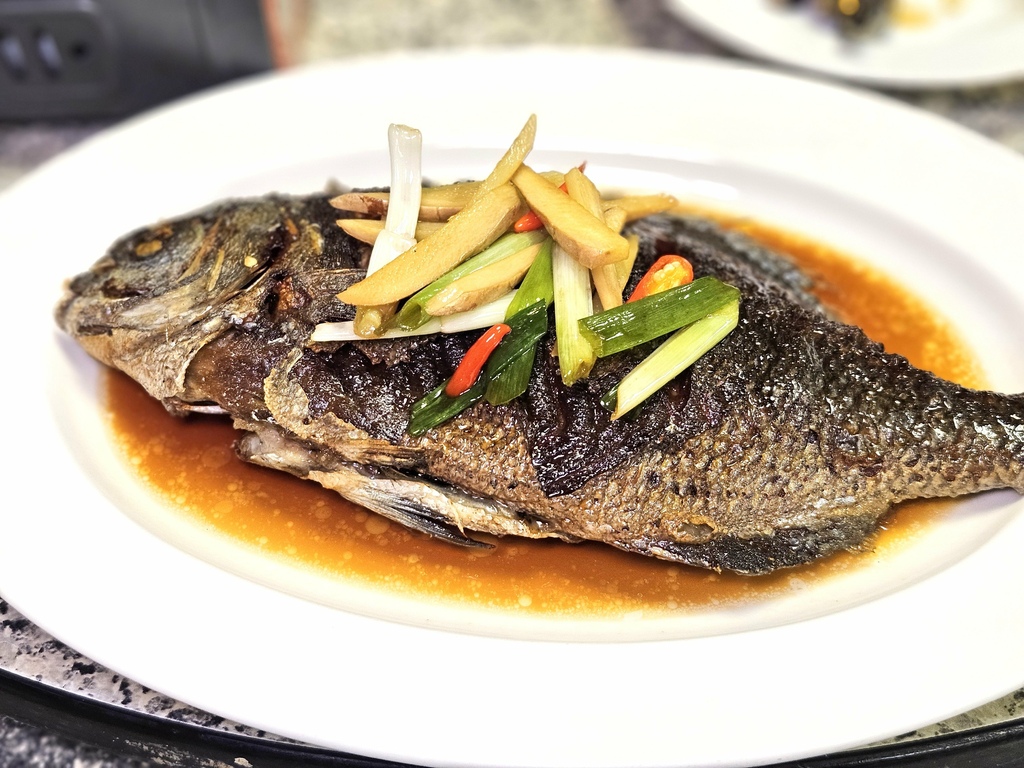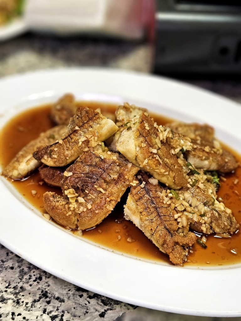 (野生黃魚卵,煎脆、鬆綿含汁,做輕柔的烏醋糖口味,最近則開始出烏魚卵了)