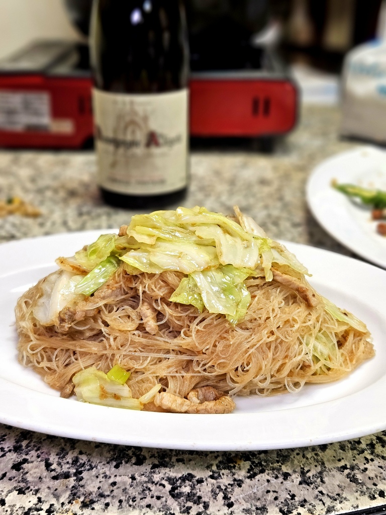 (炒米粉,偏濕的輕沙茶口味,我今年吃到最喜歡的是台中元紀的炒米粉,帶了一支aligote,酸度搭中餐挺好)