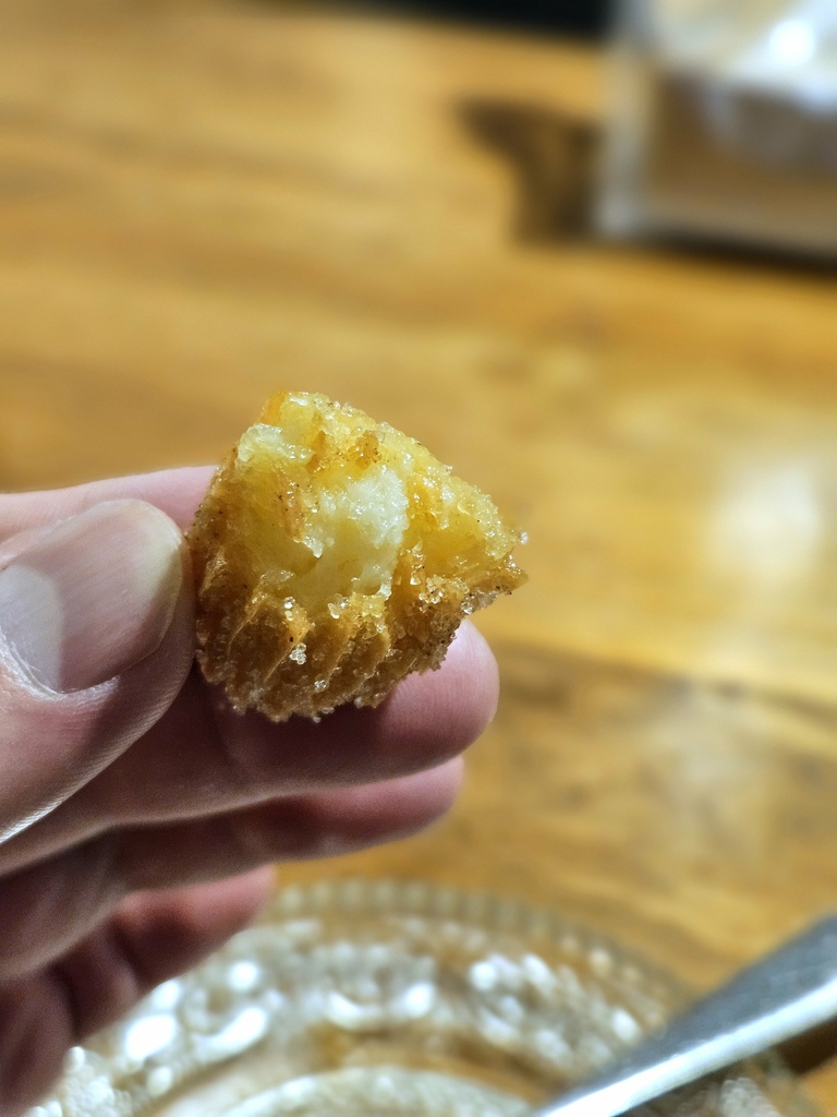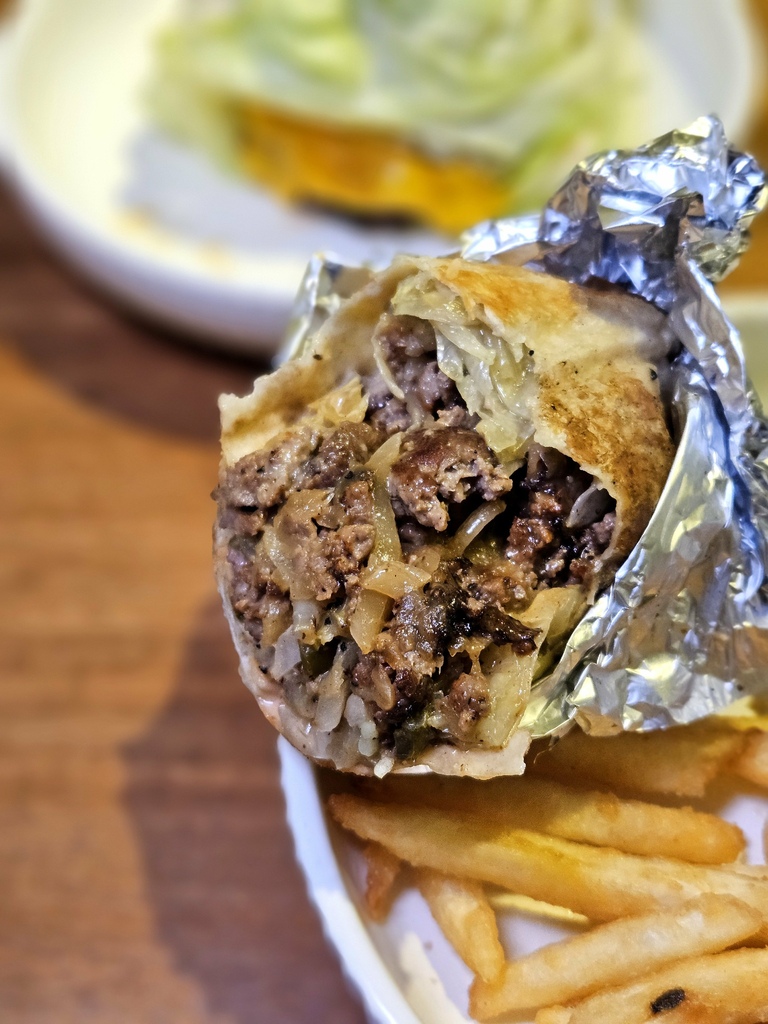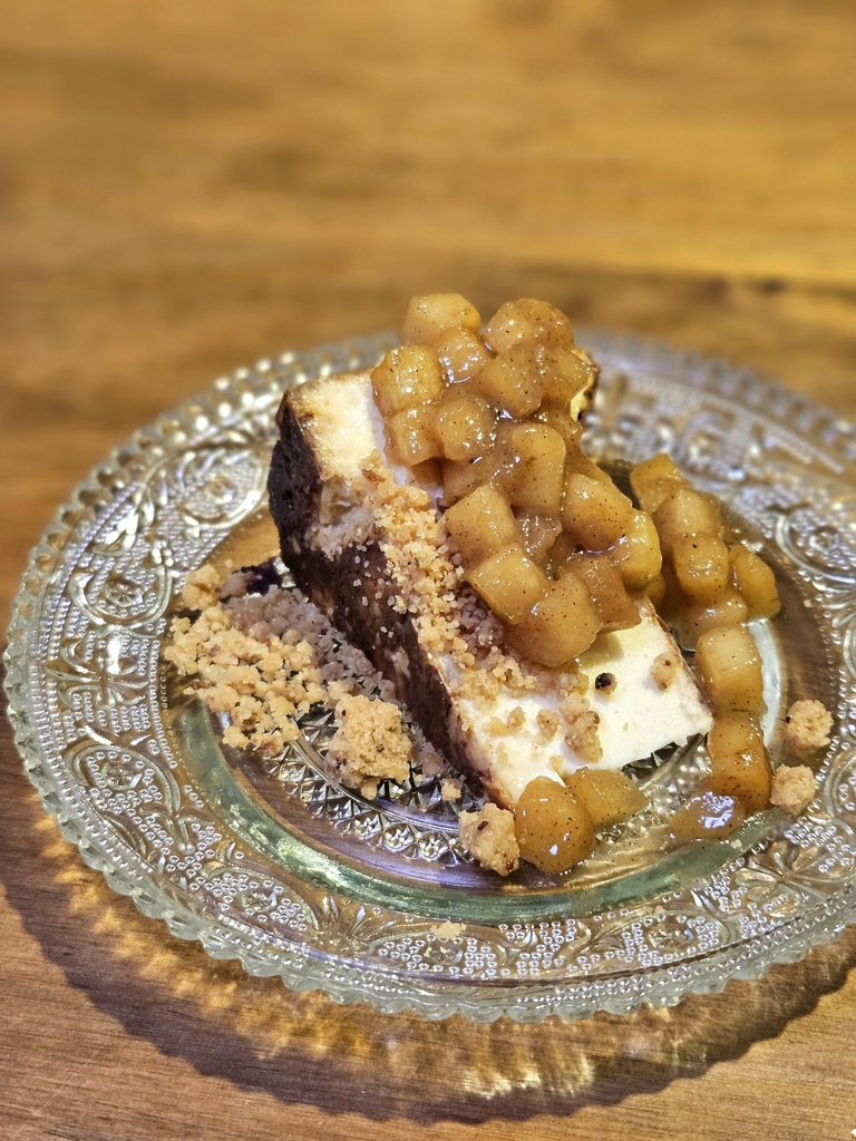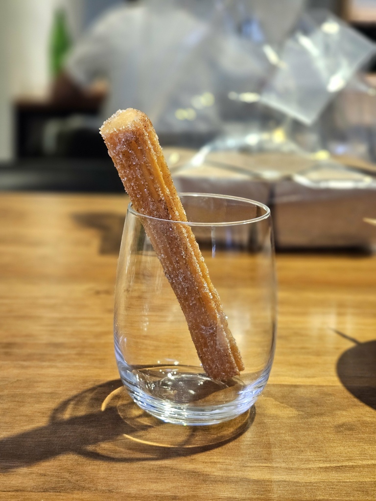 Stanly之前一直推薦我吃chopped cheese burrito,這個好、蠻炸裂,牛肉梅納夠香也嫩,一捲足有8oz可分兩次吃,下次還會再來吃,另外不可遺漏的其實是甜點(畢竟他們從加州歸來的,甜點師曾待過加州bouchon bakery),之前的布丁及這次的肉桂蘋果起司蛋糕都挺好,炸了一根吉拿棒給我,夠脆不糊不油,下次試一下紅絲絨或紅蘿蔔蛋糕好了。